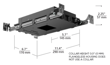 Flangeless housings (non-wood ceiling option) include die cast plaster plate with no-fill collar that installs after the ceiling to prevent cracking by unifying the plate, ceiling, and housing. Plaster plate is to be mudded over, directly up to the aperture for seamless appearance.