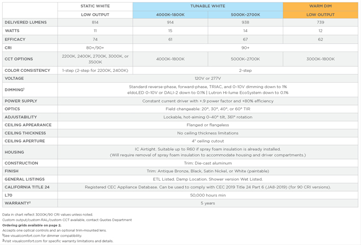 The ELEMENT 3" LED Downlight Remodel Adjustable IC offers a below-the-ceiling installation where a seamless, mud-in look or a traditional flanged appearance is desired in an insulation-contact application. Additionally, the New Construction Mounting option, offered in the same product series, provides additional installation flexibility and a small housing that fits into tight ceiling conditions. This product utilizes a similar LED module as our ELEMENT 2" Platform to accommodate the smaller housing, and features a 40° tilt and 361° rotation. The Flangeless mud plate is integral to the housing while still allowing below-the-ceiling servicing and installation. Die-cast trims are offered in Square or Round, Beveled or Flat, and Flanged or Flangeless. Finishes match ELEMENT New Construction trims for a coordinating aesthetic. IC-Rated and airtight Tool-free aiming and locking: 0°-40° tilt and 361° rotation Flangeless mud plate allows below-the-ceiling servicing and installation Trims match the ELEMENT 3" Platform Suitable for confined plenums Available with optional New Construction mounting hardware Reverse-phase, forward-phase, and TRIAC dimming down to 1% Multiple trim reflector options are available Solite Soft Focus lens options are available 1-step static white, 2-step warm dim and tunable white