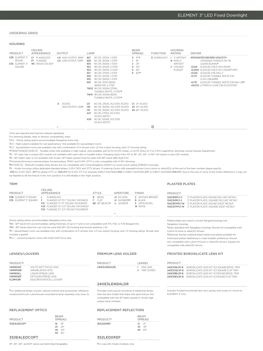 The ELEMENT 3” Next Generation fixed recessed downlight features a patented high/low lamp positioning which allows the LED to be positioned closer to the aperture for maximum light output and efficiency or higher to minimize glare and flash on the trim. Options include premium warm dimming options, Xicato and Xicato Artist Series LED options, flanged or flangeless trim options including a flangeless wood ceiling option.