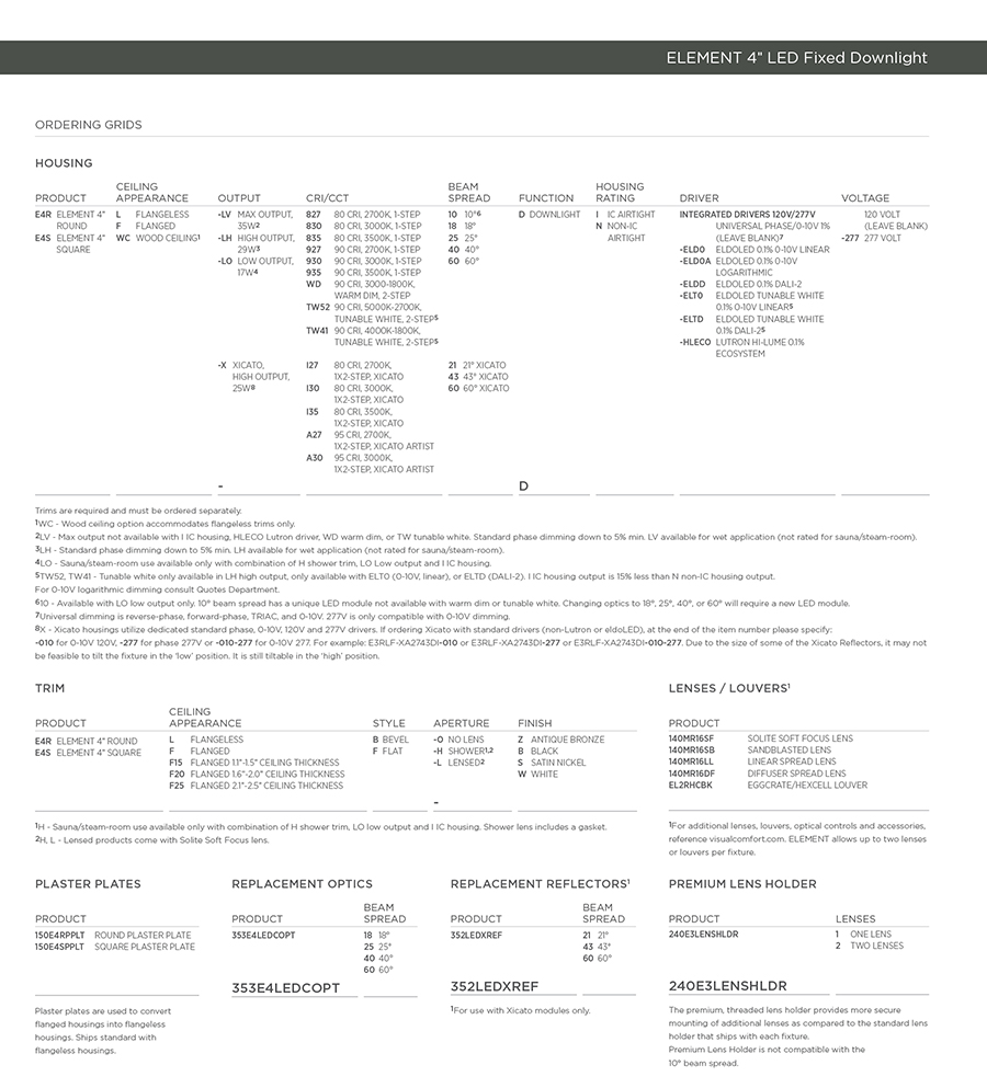 The ELEMENT 4” Next Generation fixed recessed downlight features a patented high/low lamp positioning which allows the LED to be positioned closer to the aperture for maximum light output and efficiency or higher to minimize glare and flash on the trim. Options include premium warm dimming options, Xicato and Xicato Artist Series LED options, flanged or flangeless trim options including a flangeless wood ceiling option.