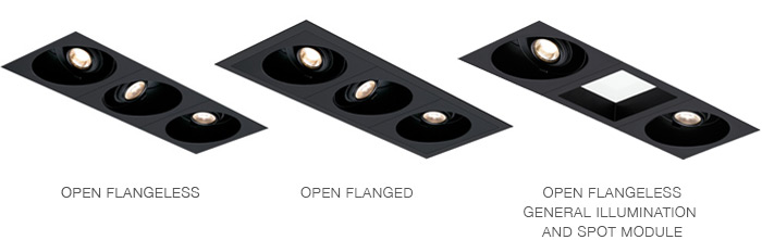 completely free of fasteners for a sleek, finished look without the use of trims - Open fixtures still allow a choice of either Flangeless (mud-in) or Flanged ceiling appearance