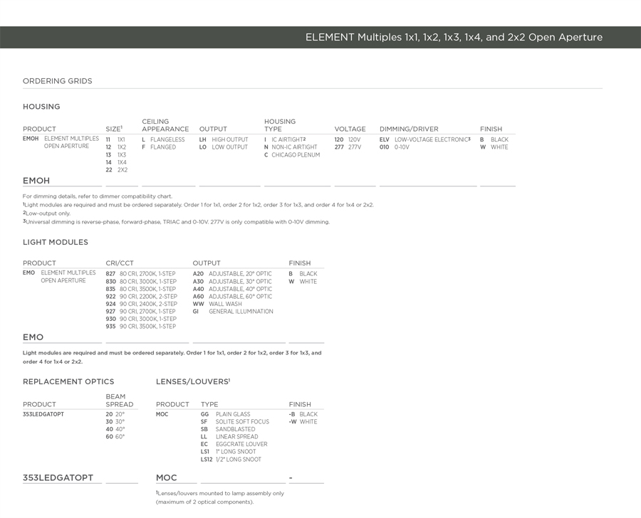 ELEMENT Multiples offers three interchangeable LED light modules: general illumination, wall wash, and adjustable spot. Light modules are sold separately to allow the ultimate in flexibility and customization options. The adjustable spot features a unique patent-pending LED dome assembly enabling remarkable tool-free adjustment and locking while maintaining full center beam candle power at all tilt & rotation angles. Although open, its thoughtful design boasts an uncommonly attractive, even sleek look below the ceiling. Available in 1x1, 1x2, 1x3, 1x4 and 2x2 configurations.