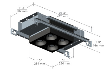 ELEMENT Multiples offers three interchangeable LED light modules: general illumination, wall wash, and adjustable spot. Light modules are sold separately to allow the ultimate in flexibility and customization options. The adjustable spot features a unique patent-pending LED dome assembly enabling remarkable tool-free adjustment and locking while maintaining full center beam candle power at all tilt & rotation angles. Although open, its thoughtful design boasts an uncommonly attractive, even sleek look below the ceiling. Available in 1x1, 1x2, 1x3, 1x4 and 2x2 configurations.